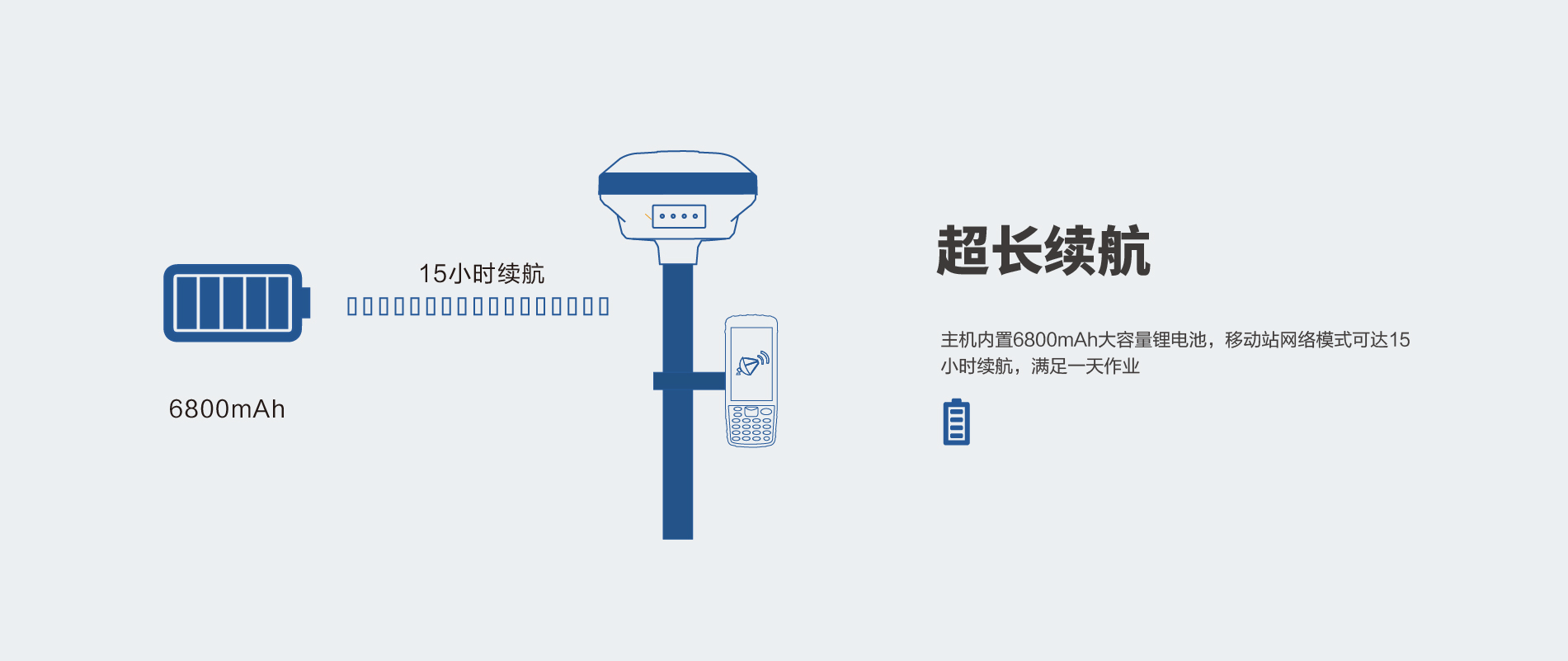 內(nèi)置6800mAh鋰電池,支持移動(dòng)站15小時(shí)續(xù)航 |
